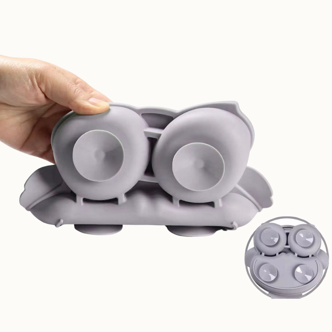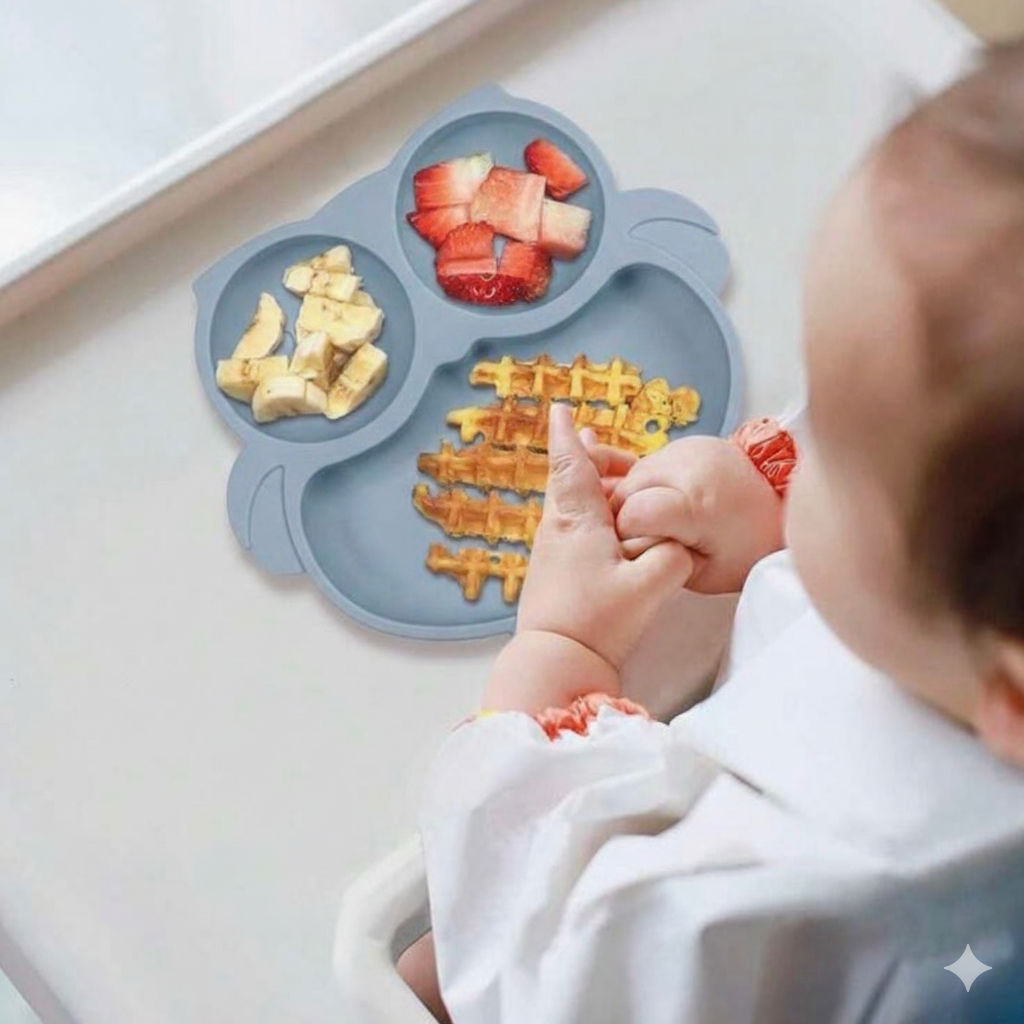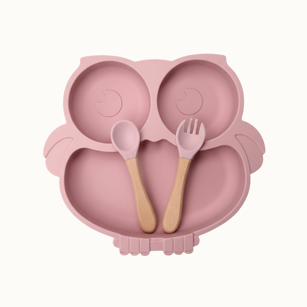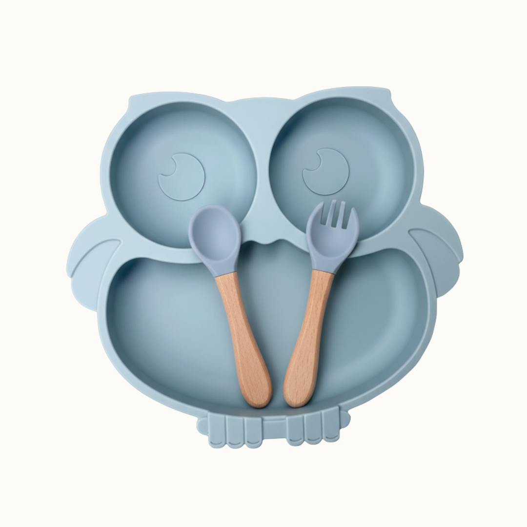 L’assiette en forme de hibou, équipée d’une ventouse antidérapante, reste bien en place pour éviter les accidents et aider l’enfant à manger sereinement.